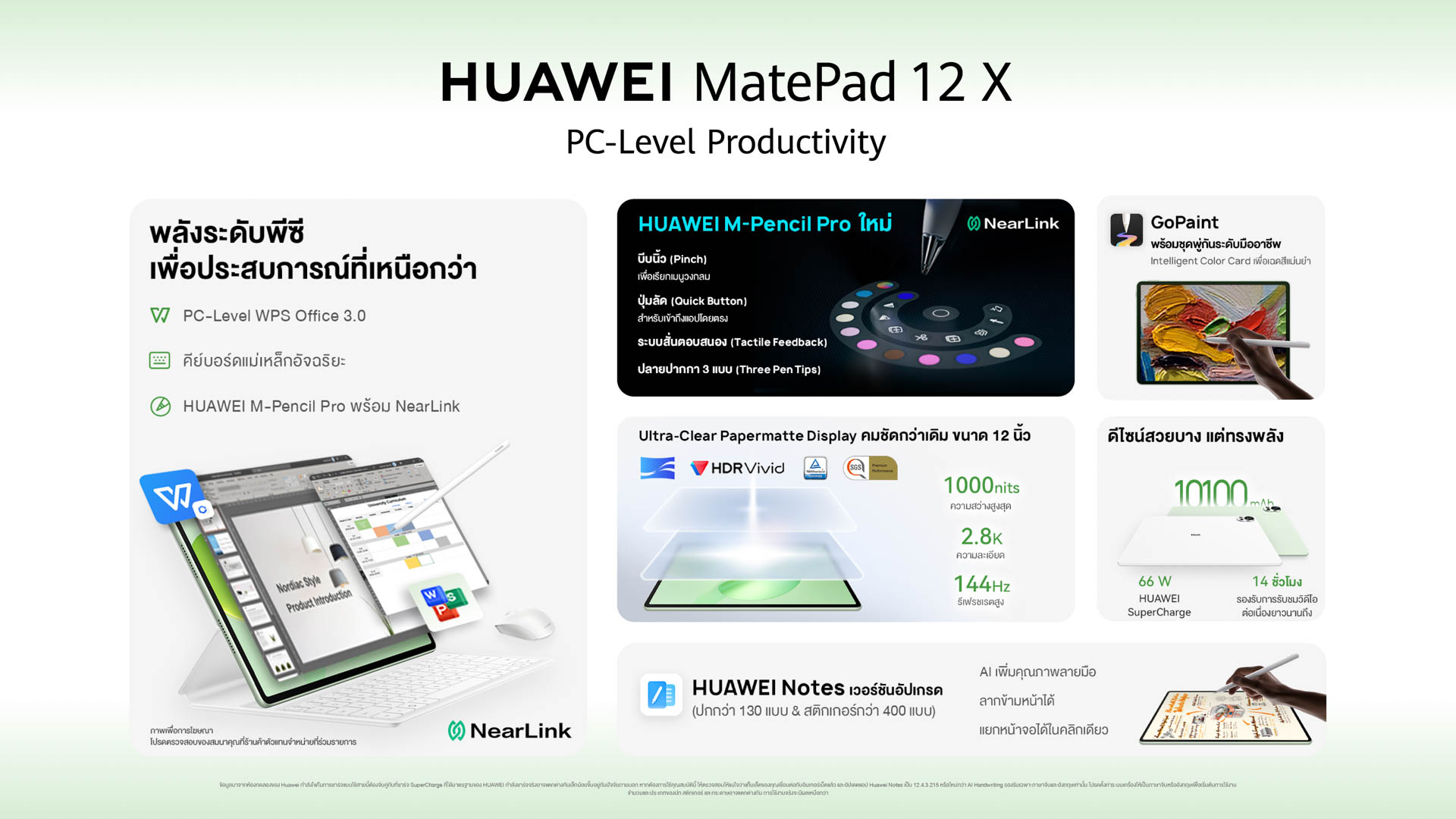 อย่าพลาดเป็นเจ้าของHUAWEI MatePad 12X (2026) ได้โดยเมื่อพรีออเดอร์ระหว่างวันที่ 25 ธันวาคม 2568 ถึง 4 มกราคม 2569 พร้อมรับสิทธิประโยชน์สุดคุ้มด้วยของสมนาคุณมูลค่ารวมถึง 15,660 บาท ได้แก่ Huawei Smart Magnetic Keyboard มูลค่า 6,990 บาท HUAWEI M-Pencil Pro มูลค่า 5,490 บาท 66W SuperCharge Power Adapter มูลค่า 1,690 บาท HUAWEI Bluetooth Mouse มูลค่า 1,490 บาท พร้อมการติดตั้งแอปพลิเคชันฟรีได้แก่ PC-level WPS Office 3.0 มูลค่า 3,990 บาท HUAWEI Notes มูลค่า 1,990 และ GoPaint มูลค่า 1,990 บาท พร้อมส่วนลดเก่าแลกใหม่ 2,000 บาท