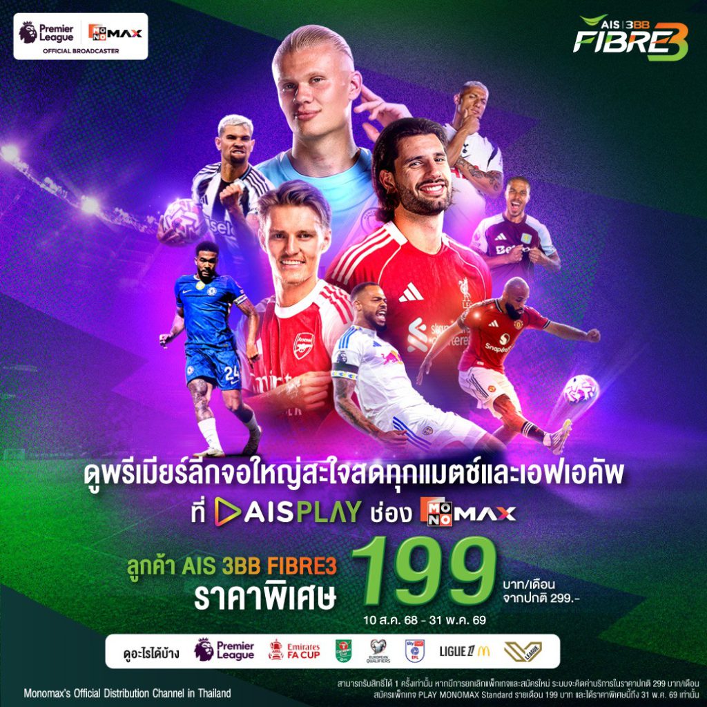 สามารถสมัครแพ็กเกจเสริมดูฟุตบอลพรีเมียร์ลีกทุกแมตซ์และเอฟเอคัพ ราคาพิเศษเพียง 199 บาท / เดือน (ปกติ 299 บาท / เดือน) เมื่อสมัครเน็ตบ้าน AIS 3BB FIBRE3 แพ็กเกจใดก็ได้ เงื่อนไขเป็นไปตามที่บริษัทกำหนด ตั้งแต่วันนี้ – วันที่ 31 พ.ค. 69 หรือดูรายละเอียดเพิ่มเติมได้ที่ https://www.ais.th/consumers/fibre/package/premier/general