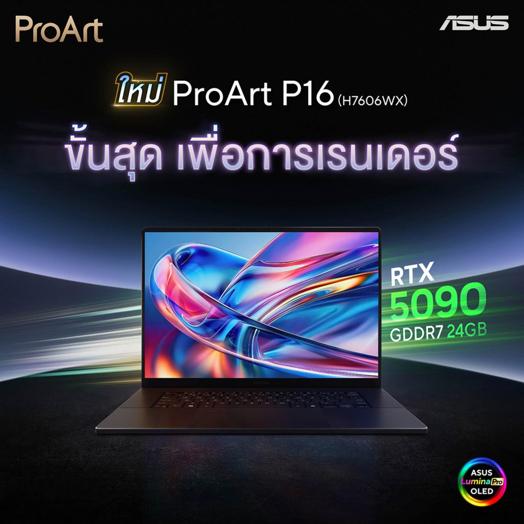 เอซุส (ประเทศไทย) เปิดตัว ProArt P16 โน้ตบุ๊กสำหรับสายครีเอเตอร์วีดีโอระดับมืออาชีพออกแบบมาเพื่อให้พลังในการสร้างสรรค์ทั้งในสตูดิโอและขณะเดินทางรองรับเวิร์กโฟลว์ของครีเอเตอร์ในหลากหลายสายงานไม่ว่าจะเป็นงานภาพยนตร์และตัดต่อวิดีโอ, แอนิเมชันและออกแบบเกม, Vlogging,ช่างภาพ, กราฟิกดีไซเนอร์, นักออกแบบผลิตภัณฑ์(Product Design & Manufacturing)มาพร้อมโปรเซสเซอร์ AMD Ryzen™ AI 9 HX 370 ที่ให้ความสามารถในการประมวลผล AIถึง50 TOPSพร้อมด้วยNVIDIA® GeForce RTX™ 5090 Laptop GPU ให้ประสิทธิภาพด้าน AI อย่างเหนือชั้นรองรับการตัดต่อวีดีโอระดับโปรเล่นไฟล์ 4K/8K ได้อย่างลื่นไหลส่งออกไฟล์ได้ไวขึ้นและเสถียรยิ่งขึ้นสำหรับไฟล์ที่มีความละเอียดสูง หน้าจอ ASUS Lumina Pro OLED รุ่นล่าสุดนี้ออกแบบมาเพื่อครีเอเตอร์ระดับมืออาชีพโดยเฉพาะให้ค่าสีที่แม่นยำเที่ยงตรงสีสันสดใสคอนทราสต์ลึกและยังถนอมสายตาผู้ใช้ ProArt P16 รุ่นล่าสุดที่มาพร้อม NVIDIA RTX AI นี้ยังช่วยเร่งความเร็วในการสร้างสรรค์งานรวมถึงการใช้แอปพลิเคชันAIจากASUSอย่าง StoryCube และ MuseTree เป็นโน้ตบุ๊ก Copilot+ PC ที่ให้คุณทำงานได้เร็วขึ้นฉลาดขึ้นและมีประสิทธิภาพมากกว่าที่เคย