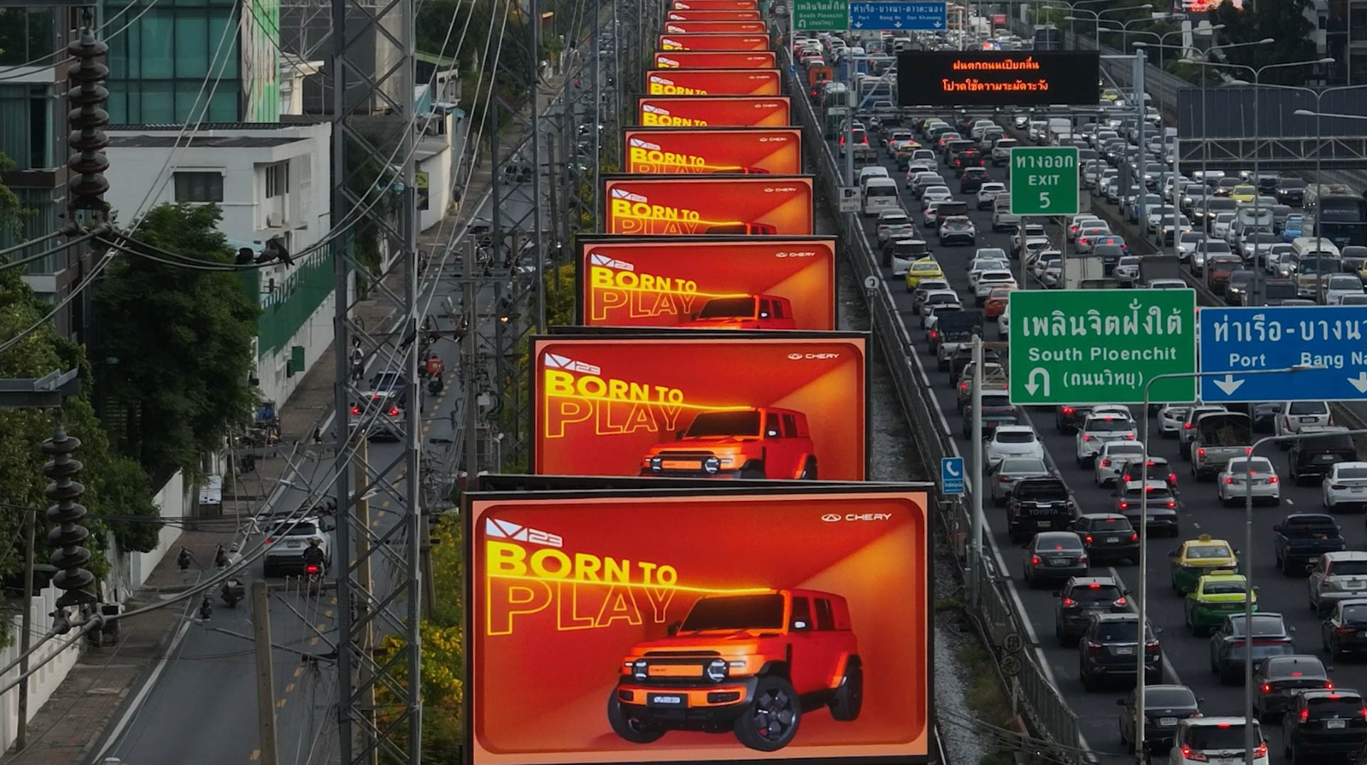 ความพิเศษของการสื่อสารด้วยสื่อโฆษณานอกบ้านให้เป็นเครื่องมือเชิงกลยุทธ์ของ CHERY ในครั้งนี้ คือ การสร้างมิติใหม่ของการโปรโมตรถยนต์ ให้มากกว่าขาย แต่ใช้ความครีเอทีฟดึงดูดสายตาด้วยดีไซน์รถสีส้มสดใส และมุมมองภาพเคลื่อนไหวเสมือนจริง ถ่ายทอดคอนเซ็ปต์ “Born to Play” บนจอ Parc Paragon The 90 Degree และ Interchange 21 — แลนด์มาร์กสำคัญที่สร้างการมองเห็นและไวรัลได้อย่างกว้างขวาง ทำให้เกิดการแชร์ต่อ อีกทั้งยังยึดพื้นที่บริเวณทางด่วนพระราม 4 ด้วย “The 20” ชุดจอดิจิทัลที่เรียงกัน 37 ต้น 74 จอ ระยะทางยาวกว่า 2.5 กิโลเมตร นับเป็นการสร้างปรากฏการณ์ครั้งสำคัญที่เปลี่ยนถนนทั้งสายให้กลายเป็นรันเวย์ของ CHERY V23 เพิ่มโอกาสในการเข้าถึงกลุ่มคนเมืองรุ่นใหม่ได้อย่างครอบคลุมทุก Touch Point