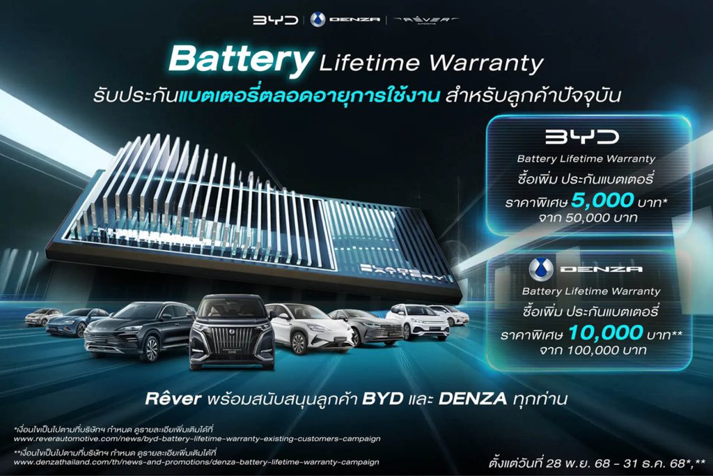 - มั่นใจกับ แพ็คเกจการรับประกันแบตเตอรี่ รวมถึงมอเตอร์ขับเคลื่อน และ ชุดควบคุมมอเตอร์ขับเคลื่อน ตลอดอายุการใช้งาน ในราคาพิเศษเพียง 5,000 บาท สำหรับ บีวายดี และ 10,000 บาท สำหรับ เดนซ่าหมดเขต 31 ธันวาคม 2568 นี้เช่นกัน