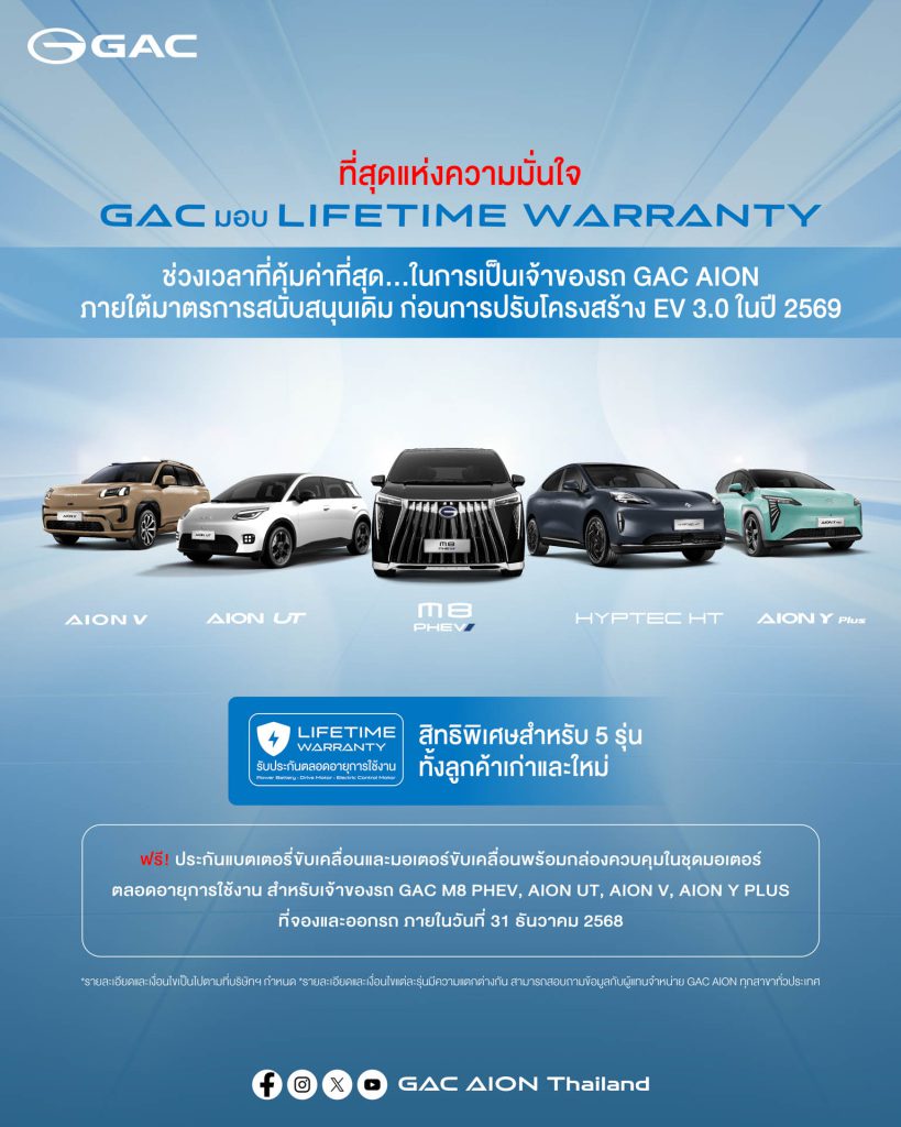 GAC AION Thailand ประกาศมอบสิทธิ์ “Lifetime Warranty” ให้กับรถยนต์รุ่น GAC HYPTEC HT, GAC M8 PHEV, GAC AION V, GAC AION UT และ GAC AION Y Plus เพื่อขอบคุณทุกความไว้วางใจและสร้างความเชื่อมั่นสูงสุดแก่ลูกค้าชาวไทย