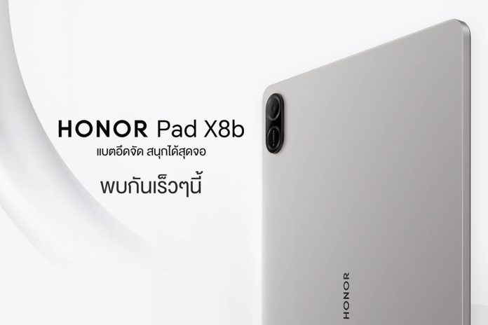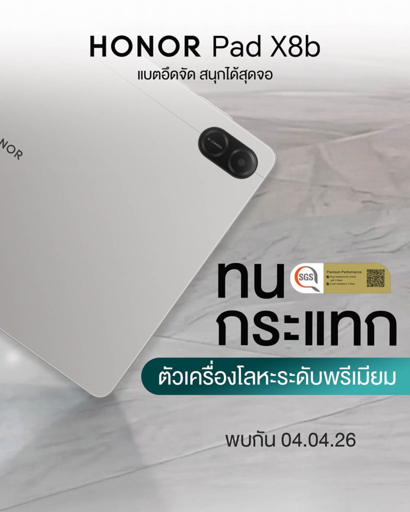 ออเนอร์(HONOR) ผู้นำด้านอุปกรณ์อัจฉริยะระดับโลก เดินหน้าเขย่าตลาดแท็บเล็ตอีกครั้งด้วยการเตรียมเปิดตัวHONOR Pad X8b ชูคอนเซปต์“แบตอึดจัดสนุกได้สุดจอ” ที่ผสานทั้งดีไซน์พรีเมียมและประสิทธิภาพไว้อย่างลงตัว เพื่อตอบโจทย์การใช้งานในทุกมิติ ไม่ว่าจะเป็นนักเรียน นักศึกษา คนทำงานรุ่นใหม่ หรือสายฟรีแลนซ์ที่ต้องการอุปกรณ์คู่ใจเพียงเครื่องเดียว ครบทั้งเรียน ทำงาน และความบันเทิง โดดเด่นด้วยหน้าจอ HONOR Eye Comfort FullView ขนาด 11 นิ้ว เสริมความอึดด้วยแบตเตอรี่ความจุ 10,100mAh ที่พร้อมลุยได้ตลอดวัน พร้อมโครงสร้างตัวเครื่องโลหะระดับพรีเมียม แข็งแรงทนทาน ผ่านการรับรองมาตรฐานความแกร่งระดับ 5 ดาวจาก SGS ประเทศสวิตเซอร์แลนด์ เตรียมเผยราคาอย่างเป็นทางการในประเทศไทยวันที่ 4 เมษายน 2569 พร้อมรับโปรโมชันและข้อเสนอพิเศษมากมาย