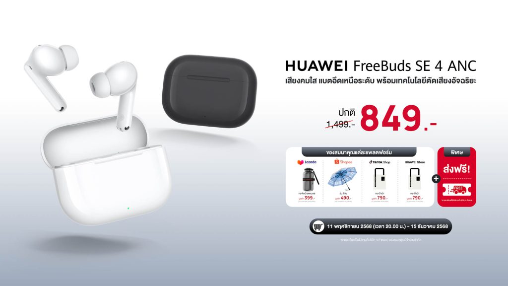 เตรียมพบกับ HUAWEI FreeBuds SE 4 ANC พร้อมโปรโมชันสุดพิเศษ ในราคาเพียง 849 บาท จากปกติ 1,499 บาท เมื่อซื้อระหว่างวันที่ 11 พฤศจิกายน 2568 เวลา 20.00 น. ถึง 15 ธันวาคม 2568 พร้อมรับของสมนาคุณเฉพาะแพลตฟอร์ม อาทิ Lazada รับกระติกน้ำสแตนเลส มูลค่า 399 บาท (เฉพาะ 200 ออเดอร์แรก) Shopee รับร่มสีเงิน มูลค่า 490 บาท (เฉพาะ 200 ออเดอร์แรก) TikTok Shop รับกระเป๋าผ้า มูลค่า 790 บาท (เฉพาะ 100 ออเดอร์แรก) และ HUAWEI Store รับกระเป๋าผ้ามูลค่า 790 บาท (เฉพาะ 50 ออเดอร์แรก) พร้อมบริการส่งฟรีในทุกแพลตฟอร์ม