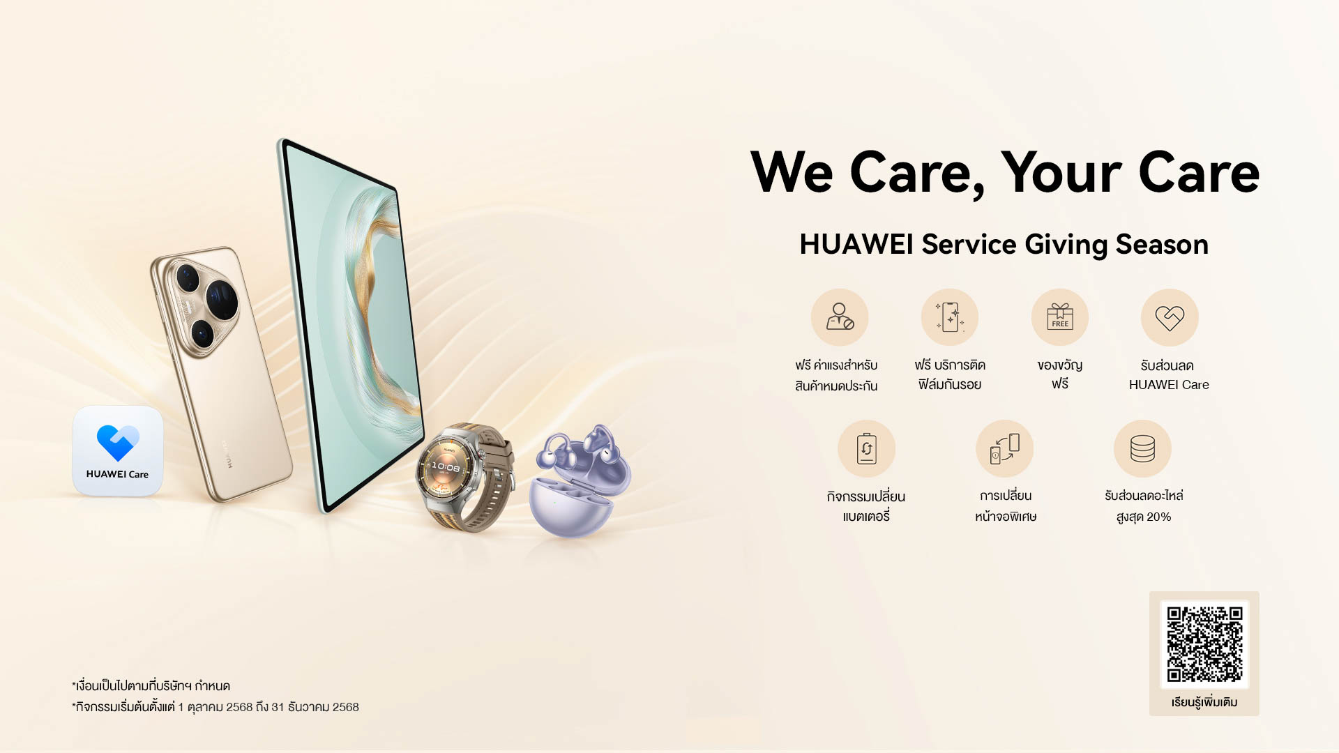 นอกจากการบริการอย่างต่อเนื่อง หัวเว่ยยังสร้างสรรค์ฤดูกาลแห่งการให้ภายใต้ชื่อแคมเปญ HUAWEI Service Giving Season 2025 ขึ้นเป็นประจำทุกสิ้นปี เพื่อแสดงความห่วงใยและส่งต่อคำขอบคุณถึงลูกค้า โดยในปี 2568 หัวเว่ยยกระดับประสบการณ์การบริการด้วยสิทธิประโยชน์มากมาย ตั้งแต่วันที่ 1 ตุลาคม 2568 ถึง 31 ธันวาคม 2568 ณ ศูนย์บริการหัวเว่ยทั่วประเทศ โดยนำเสนอสิทธิพิเศษที่ตอบโจทย์ความต้องการที่แท้จริงของผู้ใช้งาน ผสมผสานระหว่างบริการที่เชื่อถือได้กับความคุ้มค่าอย่างแท้จริง