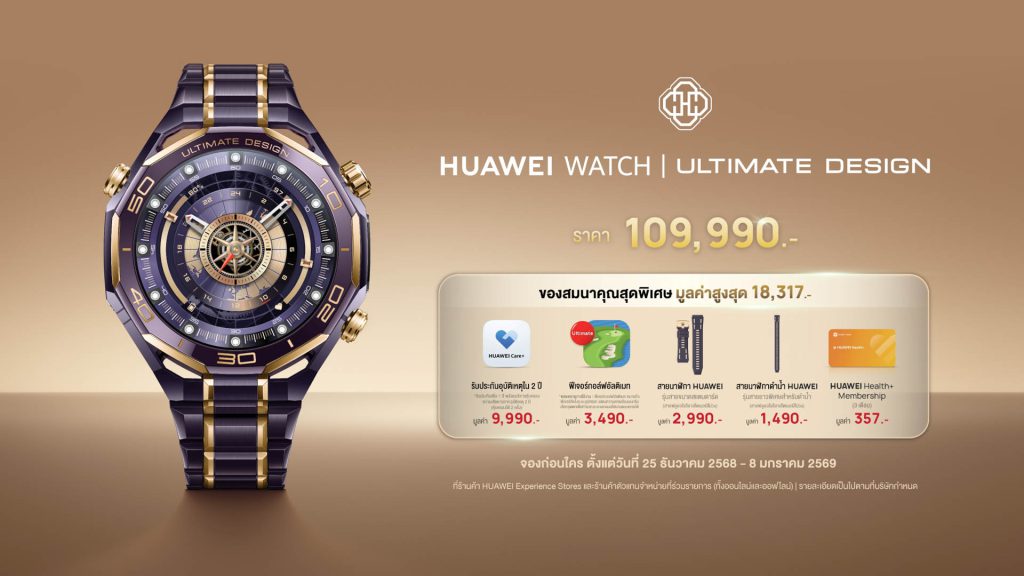 HUAWEI WATCH ULTIMATE DESIGN Royal Gold ใหม่นี้ไม่เพียงทลายขีดจำกัดทางสุนทรียศาสตร์ของสมาร์ทวอทช์และเทคโนโลยีบนอุปกรณ์สวมใส่ แต่ยังสร้างนิยามใหม่ให้กับสมาร์ทวอทช์ระดับไฮเอนด์ มอบประสิทธิภาพระดับมาสเตอร์พีซและสไตล์อันประณีตในทุกๆ วัน ใช้งานต่อเนื่องได้นานสูงสุด 11 วันรองรับเทคโนโลยีชาร์จเร็วแบบไร้สาย HUAWEI WATCH Wireless SuperCharger (2nd Generation) ซึ่งแถมมาให้กับตัวเครื่อง โดยชาร์จเพียง 15 นาทีสามารถใช้งานได้ยาวนานตลอดวัน เตรียมวางจำหน่ายในประเทศไทยวันที่ 9 มกราคม 2569 ที่ราคา 109,990 บาท พิเศษ! รับของสมนาคุณมูลค่าสูงสุด 18,317 บาท ได้แก่ HUAWEI Care+ รับประกันอุบัติเหตุใน 2 ปี มูลค่า 9,990 บาท, ฟีเจอร์กอล์ฟอัลติเมทตลอดอายุการใช้งาน มูลค่า 3,490 บาท, สายนาฬิกา HUAWEI รุ่นสายขนาดสแตนดาร์ด มูลค่า 2,990 บาท, สายนาฬิกาดำน้ำ HUAWEI รุ่นสายยาวพิเศษสำหรับดำน้ำ มูลค่า 1,490 บาท และ HUAWEI Health+ Membership ระยะเวลา 3 เดือน มูลค่า 357 บาท (เงื่อนไขและรายละเอียดเป็นไปตามที่บริษัทกำหนด) เมื่อสั่งจองตั้งแต่วันที่ 25 ธันวาคม 2568 ถึงวันที่ 8 มกราคม 2569 ผ่านหน้าร้าน HUAWEI Experience Store และตัวแทนจำหน่ายที่ร่วมรายการ รวมถึงร้านค้าอย่างเป็นทางการบนช่องทางออนไลน์ทั้ง HUAWEI Store, Lazada, Shopee และ TikTok Shop
