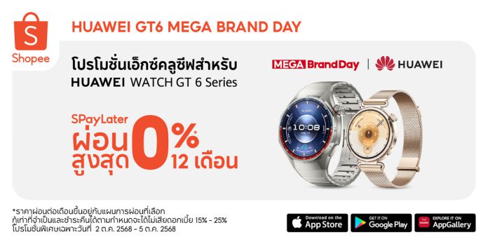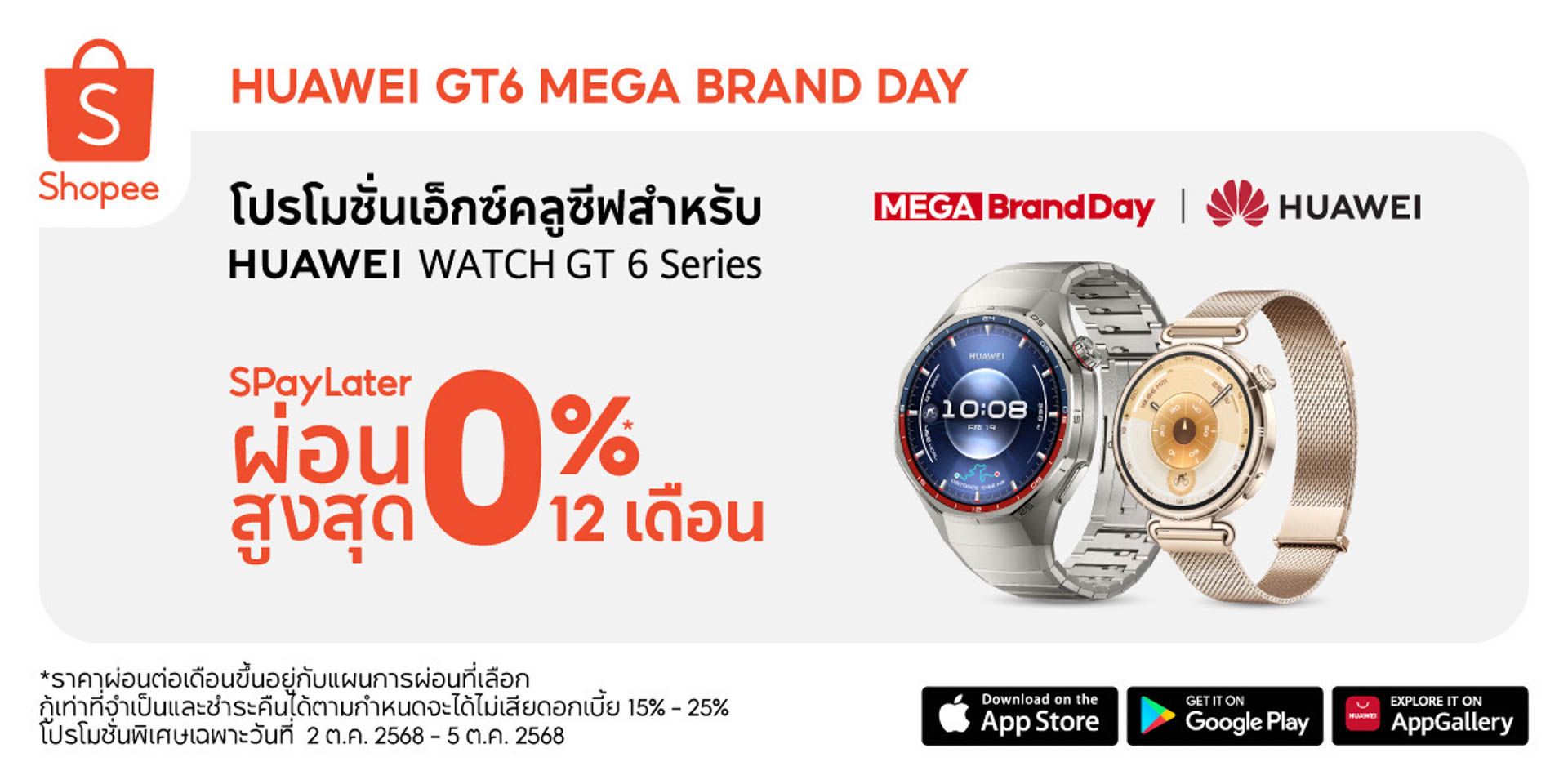 ประกาศโปรโมชันพิเศษสำหรับสมาร์ทวอทช์รุ่นใหม่ล่าสุด HUAWEI WATCH GT 6 Series มอบความคุ้มค่าและความสะดวกสบายแก่ผู้บริโภค ด้วยสิทธิพิเศษการผ่อนชำระผ่าน SPayLater แบบดอกเบี้ย 0% สูงสุด 12 เดือน เพื่อให้ทุกคนสามารถเข้าถึงนวัตกรรมสุดล้ำได้ง่ายขึ้น และตอบโจทย์ไลฟ์สไตล์ยุคใหม่ที่ใส่ใจทั้งสุขภาพและแฟชันไปพร้อมกัน