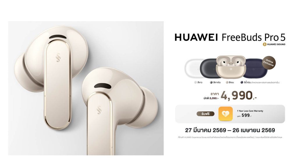 HUAWEI FreeBuds Pro 5 วางจำหน่ายในสีขาว สีเทาเข้ม สีทอง และสีน้ำเงิน (สีน้ำเงินจำหน่ายเฉพาะช่องทางออนไลน์) พิเศษเมื่อสั่งซื้อระหว่างวันที่27 มีนาคม 2569 – 26 เมษายน 2569ราคาเพียง4,990 บาท (จากราคาปกติ 5,990 บาท) พร้อมรับฟรี!1 Year Loss Care Warranty มูลค่า 599 บาท สามารถสั่งซื้อได้ที่หน้าร้าน HUAWEI Experience Store ร้านค้าตัวแทนจำหน่ายที่ร่วมรายการ และช่องทางออนไลน์ HUAWEI Store, Lazada, Shopee และ TikTok Shop