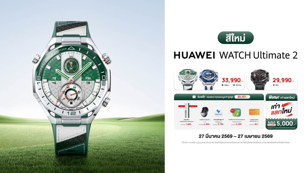 HUAWEI WATCH Ultimate 2 วางจำหน่ายในสีเขียว (สีใหม่) และสีน้ำเงิน ในราคา 33,990 บาท ส่วนสีดำ ราคา 29,990 บาท พิเศษเมื่อสั่งซื้อระหว่างวันที่27 มีนาคม 2569 – 27 เมษายน 2569รับฟรี!ของสมนาคุณรวมมูลค่าสูงสุด 20,107 บาทได้แก่ สายนาฬิกา HUAWEI Watch Ultimate 2 มูลค่าสูงสุด 7,480 บาท, HUAWEI FreeBuds 5 (เฉพาะรุ่นที่กำหนด) มูลค่าสูงสุด 4,990 บาท, ประกันอุบัติเหตุ 2 ปี HUAWEI Care+ มูลค่าสูงสุด 3,790 บาท, HUAWEI Golf Ultimate Features (เปิดใช้งานฟรีตลอดชีพ) มูลค่าสูงสุด 3,490 บาท และ HUAWEI Health+ Membership มูลค่าสูงสุด 357 บาท พร้อมข้อเสนอพิเศษเก่าแลกใหม่รับส่วนลดเพิ่มทันที 5,000 บาทสามารถสั่งซื้อได้ที่หน้าร้าน HUAWEI Experience Store ร้านค้าตัวแทนจำหน่ายที่ร่วมรายการ และช่องทางออนไลน์ HUAWEI Store, Lazada, Shopee และ TikTok Shop