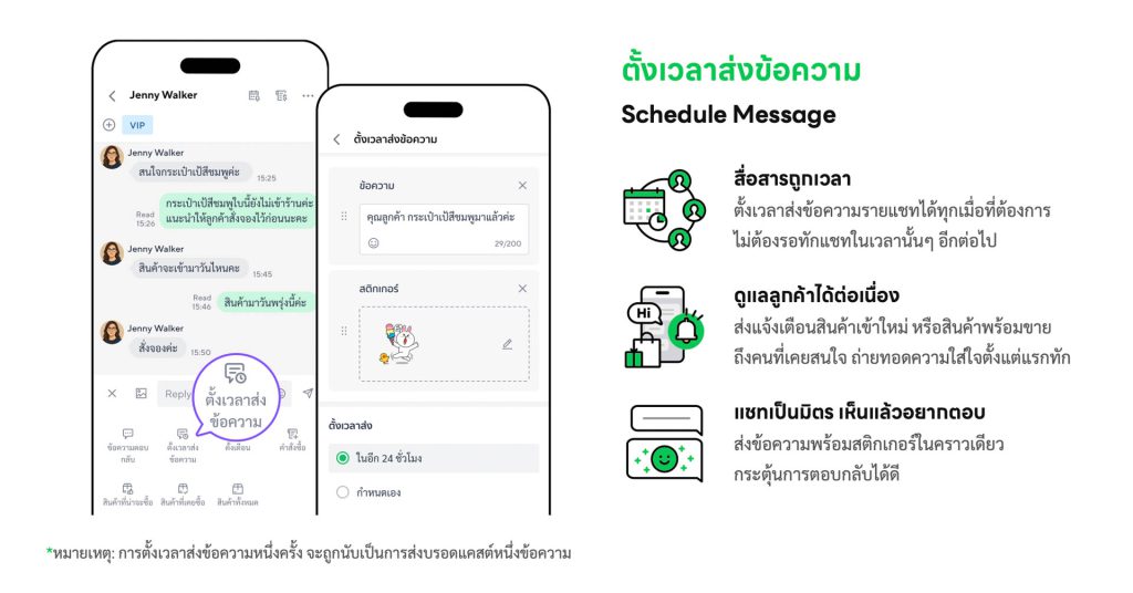 ร้านค้าสามารถตั้งวันและเวลาในการส่งข้อความหาลูกค้าล่วงหน้าแบบรายคนได้ ช่วยให้แอดมินสื่อสารกับลูกค้าได้ทันเวลา ตรงใจ และต่อเนื่องมากยิ่งขึ้น ไม่ว่าจะเป็นการแจ้งเตือนสินค้าใหม่ สินค้าพร้อมขาย หรือโปรโมชันพิเศษถึงลูกค้าที่เคยสนใจ แสดงถึงการดูแลใส่ใจในการขาย ไม่พลาดการให้ข้อมูลที่ลูกค้าแต่ละคนรอคอยได้อย่างตรงจังหวะ นอกจากนี้ยังสามารถแนบสติกเกอร์ส่งไปพร้อมกันเพื่อเพิ่มความเป็นมิตรในการสื่อสาร ช่วยเพิ่มโอกาสในการปิดการขายและสร้างความสัมพันธ์ระยะยาวกับลูกค้า ทั้งนี้ การส่งข้อความจากการใช้ฟีเจอร์ตั้งเวลาส่งหนึ่งครั้ง จะถูกนับเป็นการส่งบรอดแคสต์หนึ่งข้อความ LINE for Business มุ่งยกระดับประสบการณ์ Chat Commerce ให้ร้านค้าแบบครบวงจรด้วยเครื่องมือที่หลากหลาย ช่วยให้ขายของได้ง่ายขึ้น ปิดยอดขายไว พร้อมช่วยจัดการร้านค้าบน LINE ได้อย่างมืออาชีพ ผู้ประกอบการ ร้านค้าที่สนใจ สามารถเริ่มใช้งานทั้ง 4 ฟีเจอร์ใหม่บน MyShop ได้แล้ววันนี้! เพียงอัปเกรดแพ็คเกจบรอดแคสต์ LINE OA เป็นแบบ “Basic” หรือ “Pro” ก็พร้อมใช้งานฟีเจอร์ใหม่ทั้งหมดบน MyShop ได้ทันที! มาร่วมยกระดับการขายบน LINE OA ของคุณให้แม่นยำ ตรงใจ ปิดการขายได้ไว รับเงินได้สะดวกกว่าที่เคยด้วย 4 ฟีเจอร์ใหม่บน MyShop กัน