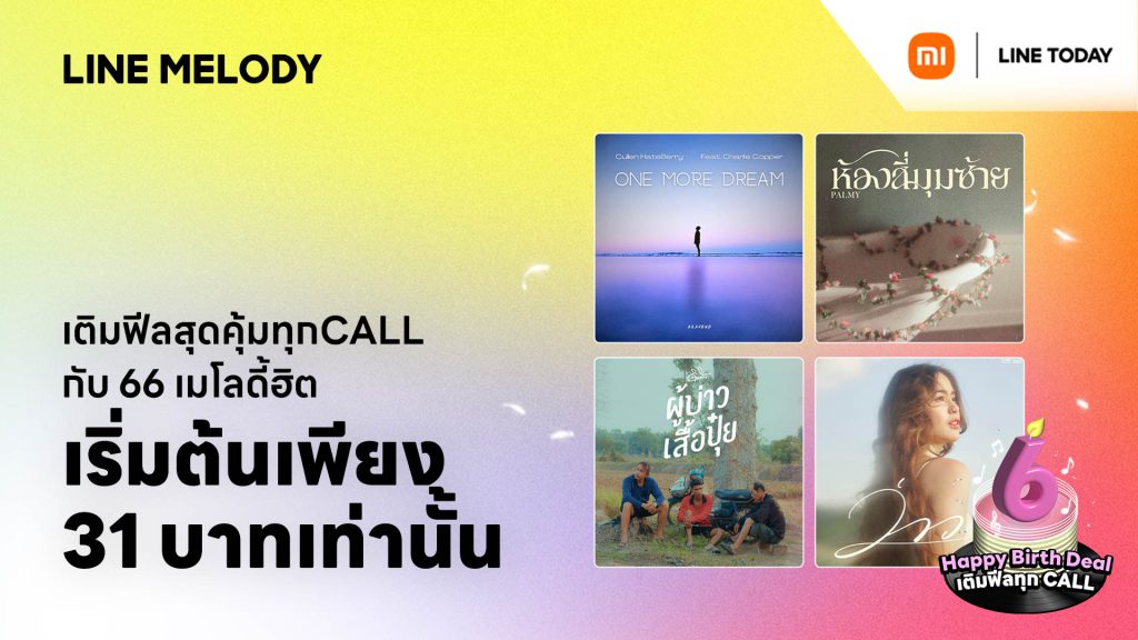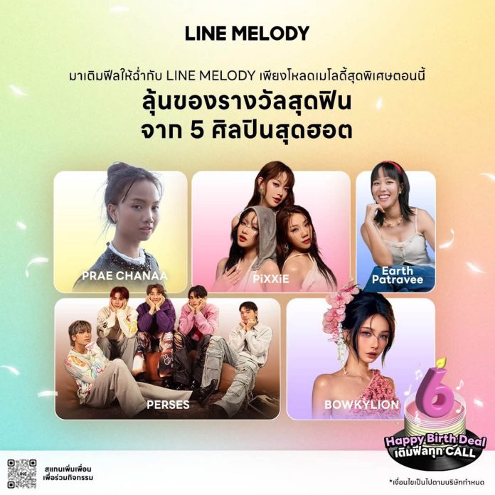 LINE MELODY เอาใจแฟน T-Pop จัดใหญ่! ขนทัพ 66 เมโลดี้จากศิลปินแนวหน้าของเมืองไทย มาเติมฟีลผู้ใช้ LINE แบบฟิน ๆ ทุก Call ด้วยเสียงรอสายจากศิลปินคนโปรด จัดแคมเปญ “Happy Birth Deal เติมฟีลทุก CALL” โปรฯ ลดแรงส่งท้ายแคมเปญ เริ่มต้นเพียง 31 บาท พร้อมลุ้นสิทธิ์ในการรับของรางวัลสุดเอ็กซ์คลูซีฟจาก 5 ศิลปินเจ้าของเพลงฮิตติดชาร์ต นำโดย BOWKYLION, PiXXiE, PERSES, EARTH PATRAVEE และ PRAE CHANAA วันที่ 19 – 25 กันยายน นี้เท่านั้น