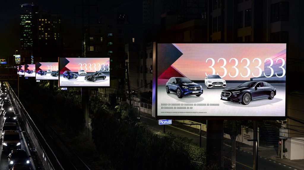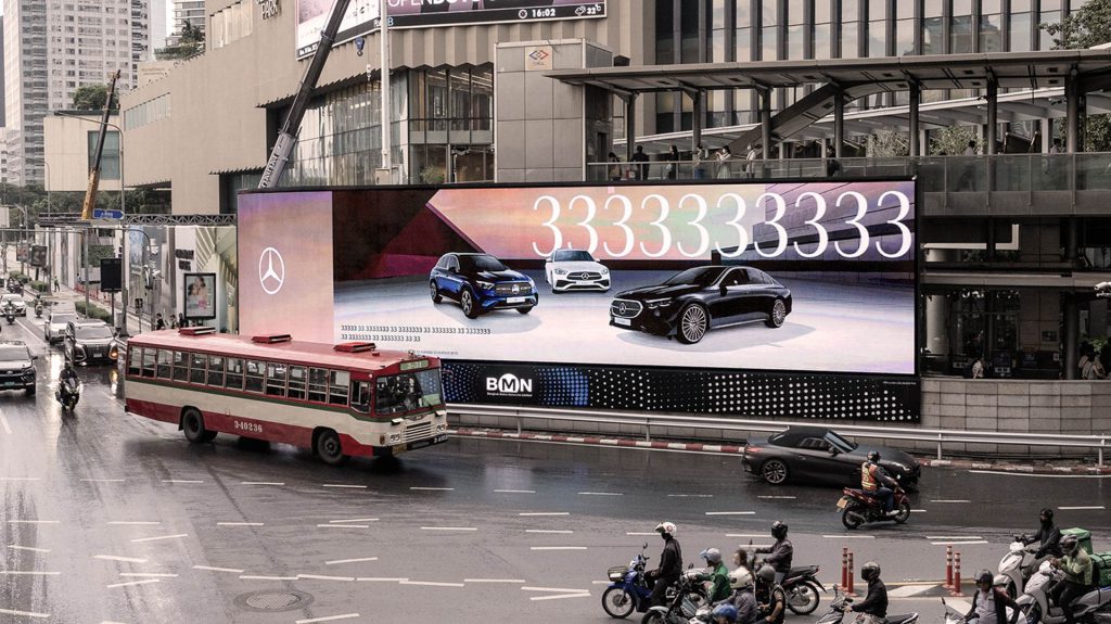 ในช่วงสัปดาห์ที่ผ่านมา คนไทยหลายคนอาจเห็นตัวเลข “333” ที่ปรากฏอยู่บนโซเชียลมีเดีย และสื่อนอกบ้านแบบ Digital Out of Home (DOOH) ที่กระจายอยู่ตามพื้นที่ใจกลางกรุงเทพมหานครซึ่งมาในรูปแบบของโฆษณาที่เนื้อหาทั้งหมดขึ้นเป็นเลข 3333333333 ไม่ว่าจะเป็นในส่วนของหัวข้อและรายละเอียดต่างๆ จนอาจเกิดข้อสงสัยมากมายว่าเลข 3 ที่ว่านี้ สื่อถึงอะไร แต่ชิ้นงานโฆษณาดังกล่าวก็ยังมีจุดสังเกตที่พอให้ผู้คนเดาออกว่าสิ่งนี้ต้องเกี่ยวข้องกับแบรนด์เมอร์เซเดส-เบนซ์ คือภาพของรถยนต์เมอร์เซเดส-เบนซ์ จำนวน 3 รุ่น