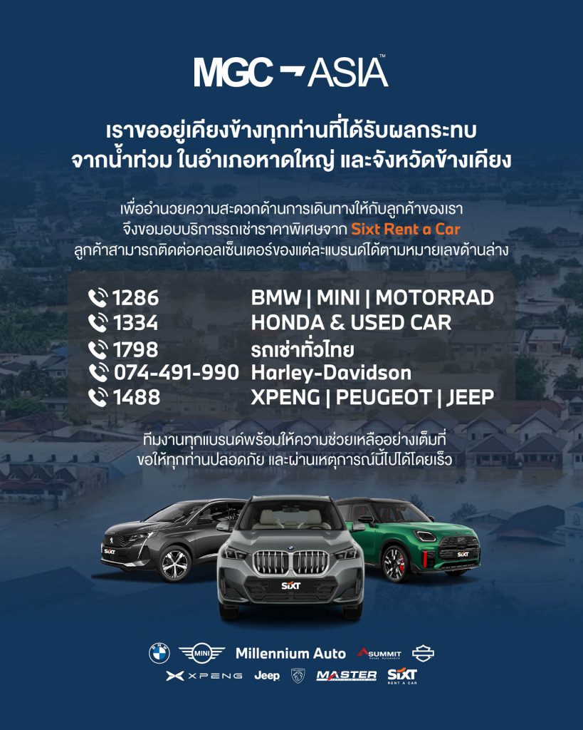 มหาอุทกภัยหาดใหญ่สร้างความเสียหายทั้งชีวิตและทรัพย์สิน หลังสถานการณ์คลี่คลาย ต้องเร่ง ฟื้นฟูพร้อมเยียวยาพี่น้องประชาชนที่ได้รับผลกระทบ เอ็มจีซี-เอเชีย ออโต้เพล็กซ์ หาดใหญ่ ภายใต้บริษัท มิลเลนเนียม กรุ๊ป คอร์ปอเรชั่น (เอเชีย) จำกัด (มหาชน) หรือ MGC-ASIA ร่วมส่งกำลังใจและความช่วยเหลือ ผ่านแคมเปญ ‘อยู่ที่ไหนจะไปหา’ จัดบริการรถยกฉุกเฉินฟรี สำหรับลูกค้า พร้อมดูแลรักษาตามมาตรฐาน รวมถึงบริการรถเช่า SIXT ในราคาพิเศษ