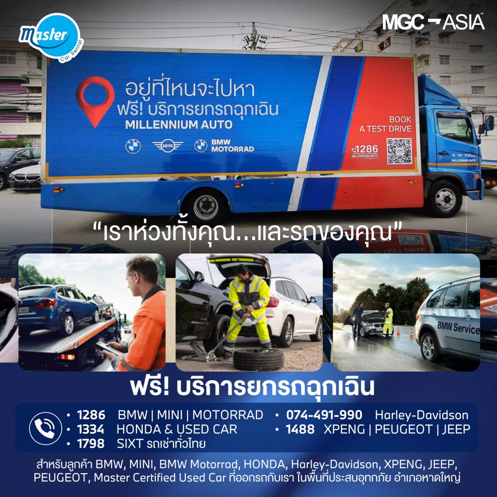 บริการรถยกฉุกเฉิน ‘ฟรี’ สำหรับลูกค้าเจ้าของรถยนต์ BMW, MINI, HONDA, XPENG, PEUGEOT, JEEP, BMW Motorrad และ Harley-Davidson ที่ได้รับผลกระทบจากสถานการณ์น้ำท่วมใหญ่ครั้งนี้ โดยมีทีมงานพร้อมประสานงาน และดำเนินการให้ความช่วยเหลือ เพื่อให้รถยนต์ของท่าน เข้าสู่การตรวจสอบและดูแล ภายในศูนย์บริการอย่างถูกต้องตามมาตรฐาน