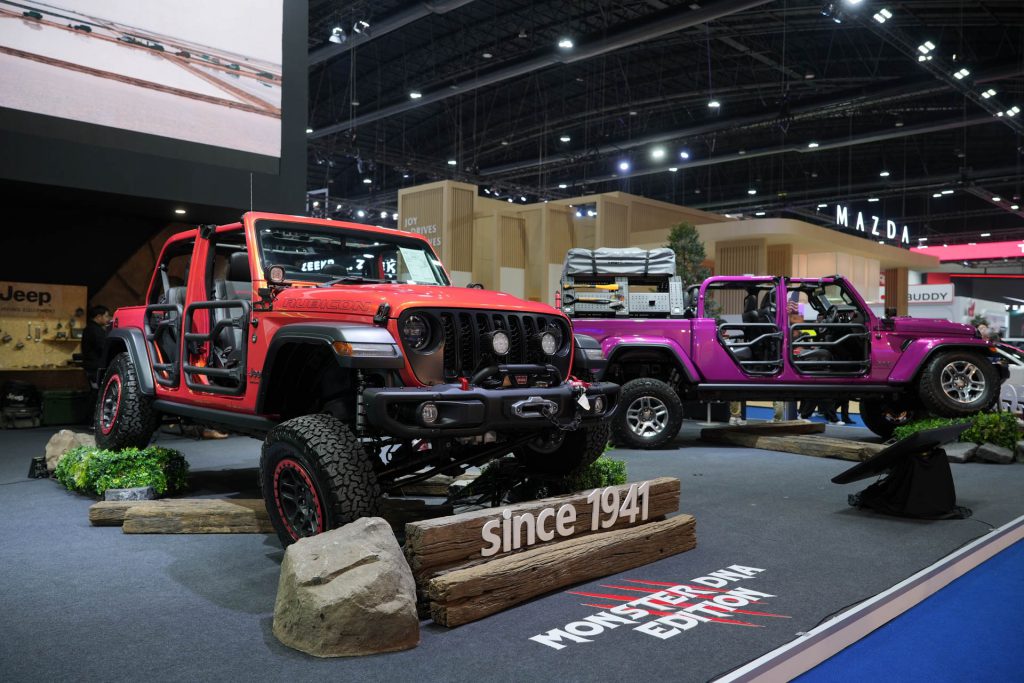 จี๊ป ประเทศไทย จัดแสดงยนตรกรรมไฮไลท์ภายใต้คอนเซปต์ ‘Monster Family’ กลาดิเอเตอร์ รูบิคอน มอนสเตอร์ เอดิชั่น มาพร้อมกับชุดแต่ง MOPAR รอบคัน ประกอบไปด้วย ชุดยก สมรรถนะสูง จาก MOPAR เพิ่มความสูงถึง 2นิ้ว กันชนหน้าเหล็กแบบชิ้นเดี่ยว พร้อมด้วยสปอตไลท์บริเวณเสาเอ และอุปกรณ์อำนวยความสะดวกด้านหลังครบครัน จัดแสดงคู่กับ จี๊ป แรงเลอร์ รูบิคิน มอนสเตอร์ เอดิชั่น สวมชุดแต่งสมรรถนะสูงจาก MOPAR มูลค่ารวมกว่าสองล้านบาท ประกอบด้วยชุดยกสมรรถนะสูงจาก Fox ล้ออัลลอยพร้อมบีดล็อก ช่วยเพิ่มประสิทธิภาพบนเส้นทางทุรกันดาร กันชนหน้าเหล็กแบบสามชิ้นพร้อมสปอตไลท์ขนาด 7 นิ้ว บริเวณกันชนหน้าและเสาเอ