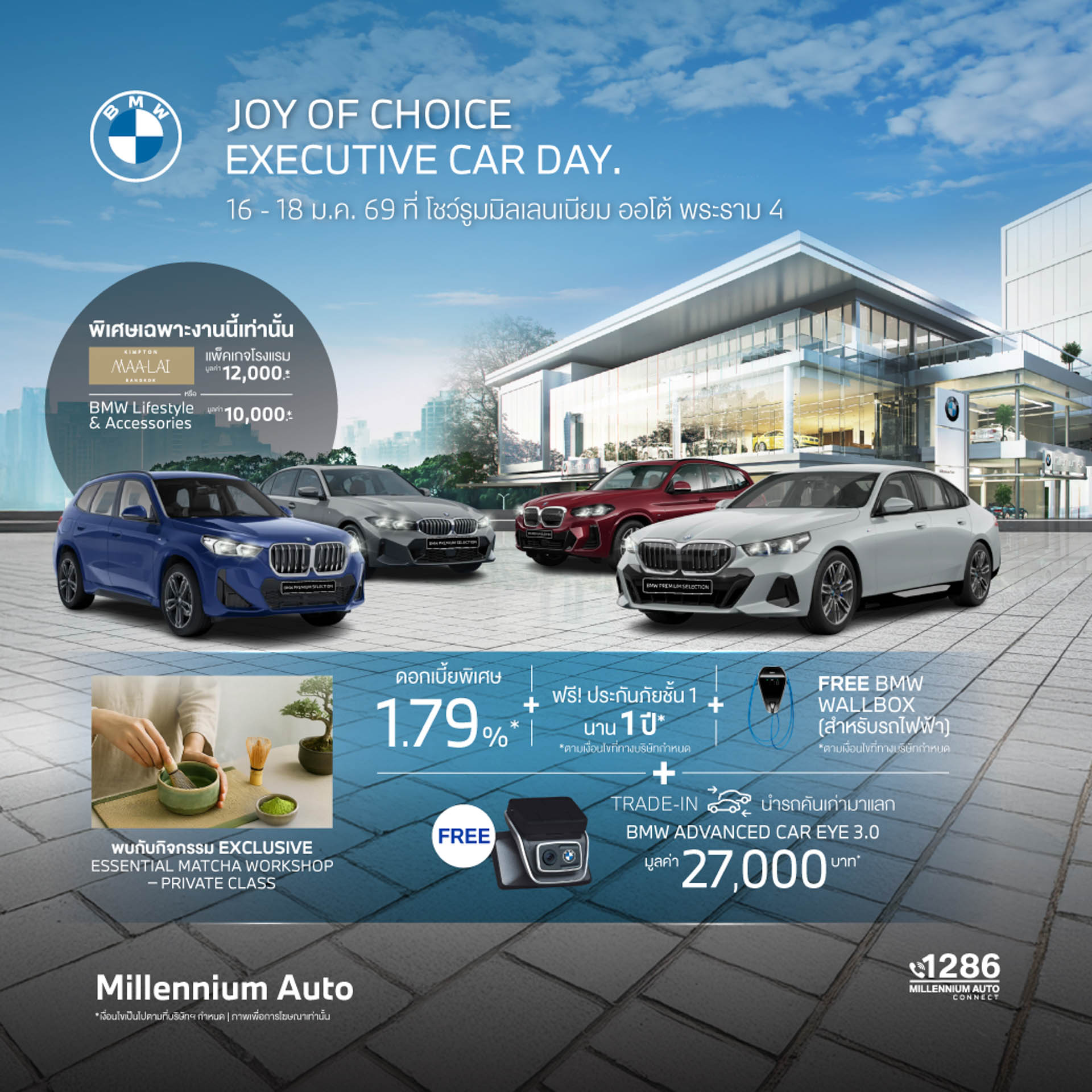 ++ ‘JOY OF CHOICE-EXECUTIVE CAR DAY’ โดนใจกับรถผู้บริหาร BMW ราคาพิเศษงานนี้ บีเอ็มดับเบิลยู มิลเลนเนียม ออโต้ นำรถผู้บริหาร บีเอ็มดับเบิลยู BMW Premium Selection หลากรุ่น หลายประเภท มาจัดแสดง ทั้งซีดานสุดหรู, ยนตรกรรมอเนกประสงค์X Series รวมถึงรถยนต์ไฟฟ้า 100% BMW i Series มาให้ลูกค้าได้สัมผัสและทดลองขับคันที่ชอบ พร้อมเพลิดเพลินกับกิจกรรม MATCHA Workshop เรียนรู้ศิลปะและคอนเซปต์ของการชงชามัฉฉะ แบบ Private Class