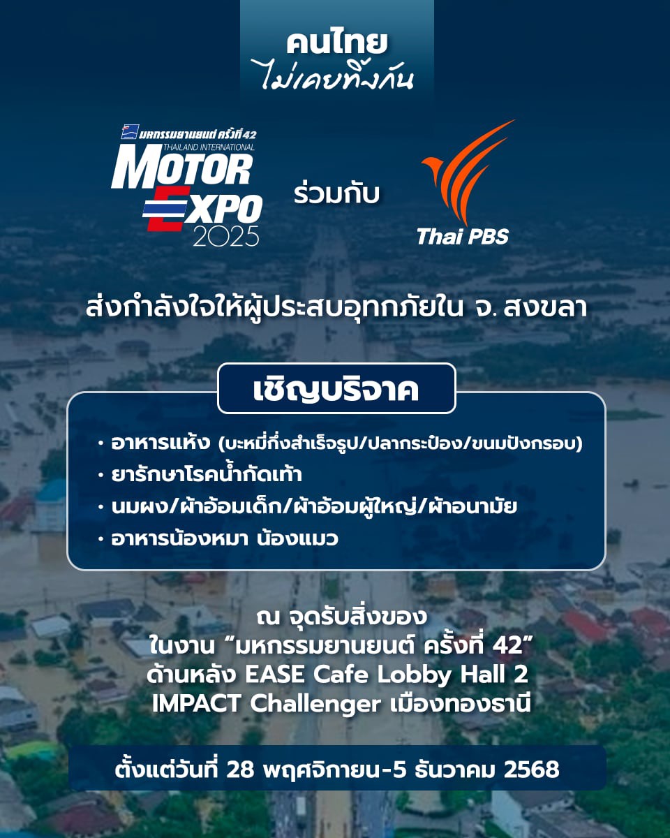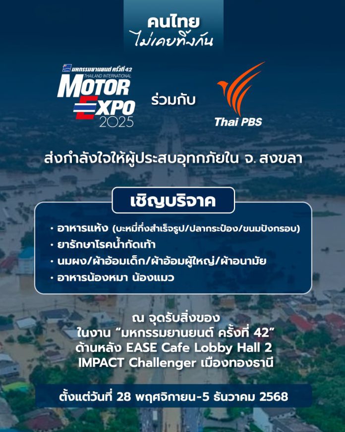 “IMC สื่อสากล” ผู้จัดงาน “มหกรรมยานยนต์” หรือ “Thailand International Motor Expo” เปิดพื้นที่รับบริจาค สิ่งของเครื่องใช้ และอาหารแห้ง ส่งต่อให้ องค์การกระจายเสียงและแพร่ภาพสาธารณะแห่งประเทศไทย (Thai PBS) เพื่อนำไปมอบให้ผู้ประสบภัยน้ำท่วม อำเภอหาดใหญ่ จังหวัดสงขลา ผู้เข้าชมงาน และประชาชนทั่วไปสามารถนำของมาบริจาคได้ที่งาน “มหกรรมยานยนต์ ครั้งที่ 42” ด้านหลัง EASE Cafe บริเวณล๊อบบี้ อาคารชาลเลนเจอร์ 2 IMPACT เมืองทองธานี ตั้งแต่วันที่ 28 พฤศจิกายน – 5 ธันวาคม 2568