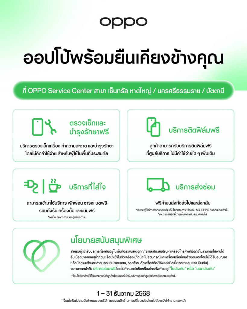 นอกจากนี้ OPPO ยังได้จัดบริการหลังการขายพิเศษ เพื่อให้ความช่วยเหลือแก่ผู้ใช้งานที่ได้รับผลกระทบจากสถานการณ์น้ำท่วม โดยเปิดให้บริการตรวจเช็ก ทำความสะอาด และบำรุงรักษาเครื่องโดยไม่มีค่าใช้จ่าย พร้อมทั้งบริการติดฟิล์มฟรี และการซ่อมแซมอุปกรณ์ที่เสียหายจากเหตุการณ์น้ำท่วม โดยสามารถใช้บริการส่งซ่อมผ่านศูนย์บริการที่ร่วมรายการ ได้แก่ OPPO Service Center เซ็นทรัลหาดใหญ่, นครศรีธรรมราช และปัตตานี โดยบริการพิเศษนี้เปิดให้บริการตั้งแต่วันที่ 1 – 31 ธันวาคม 2568 ออปโป้ ประเทศไทย ขอส่งกำลังใจให้ทุกชุมชนในภาคใต้ผ่านพ้นสถานการณ์ และกลับสู่วิถีชีวิตปกติได้โดยเร็ว