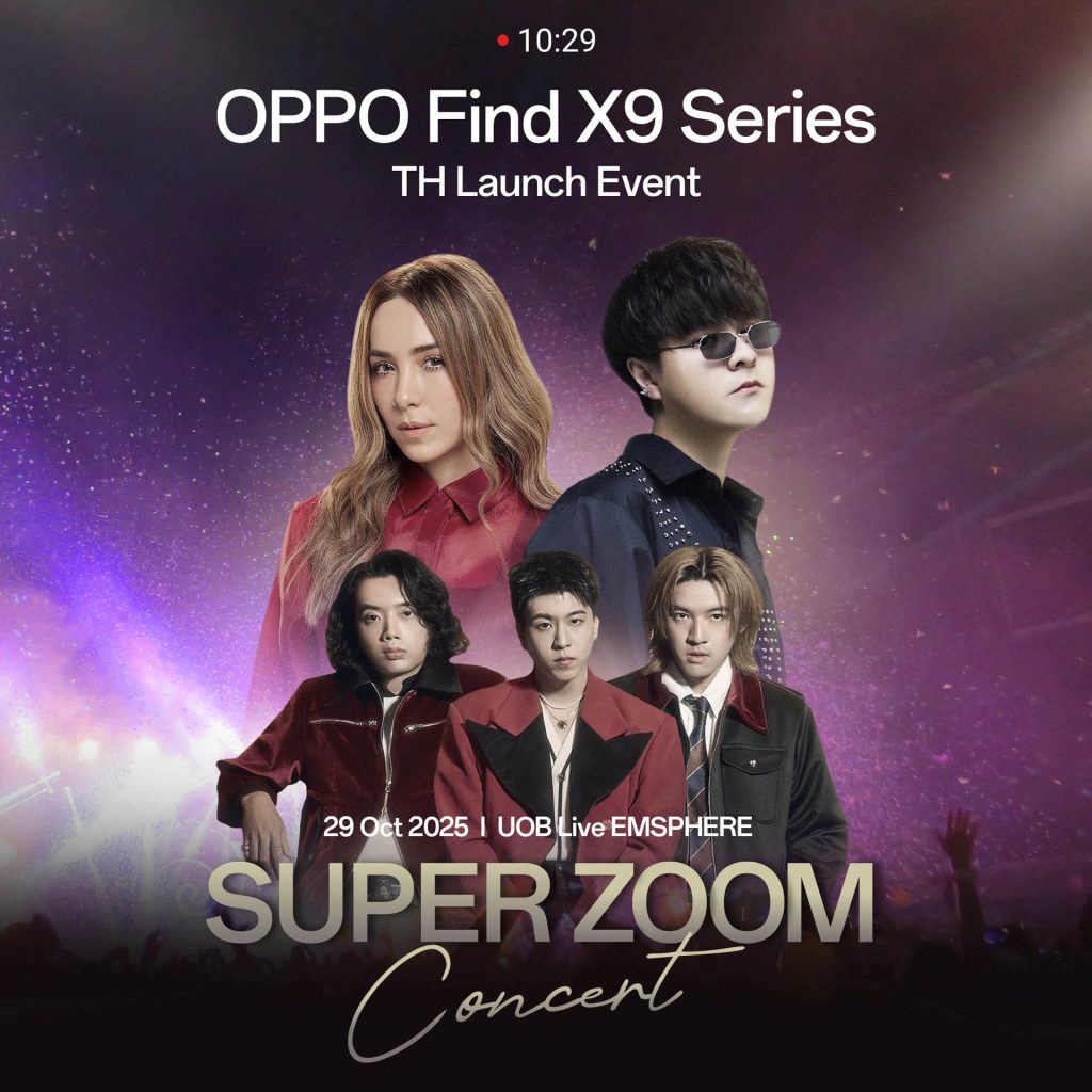 ออปโป้ ประเทศไทยเตรียมเปิดตัว OPPO Find X9 Series สมาร์ตโฟนแฟลกชิปซูมดีทุกคอนเสิร์ต พร้อมเตรียมพบกับประสบการณ์ความชัดระดับแฟลกชิปจาก OPPO กับงาน “Super Zoom Concert” คอนเสิร์ตครั้งใหญ่ที่รวมความบันเทิงและเทคโนโลยีเข้าไว้ด้วยกันอย่างลงตัว เพื่อเฉลิมฉลองการเปิดตัวสมาร์ตโฟนรุ่นใหม่ล่าสุด OPPO Find X9 Series สมาร์ตโฟนแฟลกชิปที่พร้อมยกระดับการซูมให้ชัดทุกองศา
