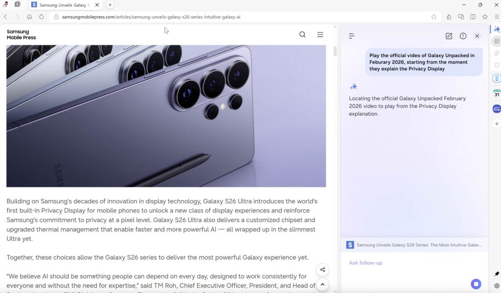 Samsung Browser for Windows จะเปิดให้ผู้ใช้งานอุปกรณ์บนระบบปฏิบัติการ Windows 11 และ Windows 10 (เวอร์ชัน 1809 ขึ้นไป) โดยฟีเจอร์ Agentic AI ใน Samsung Browser ทั้งบน Windows และ Android5 ได้เปิดให้ใช้งานแล้วในเกาหลีใต้ และสหรัฐอเมริกา ก่อนขยายไปยังตลาดอื่นๆ ในอนาคต ดูข้อมูลเพิ่มเติมเกี่ยวกับ Samsung Browser ได้ที่ browser.samsung.com