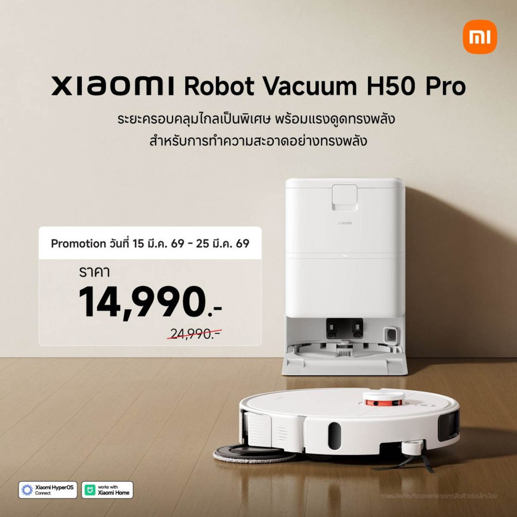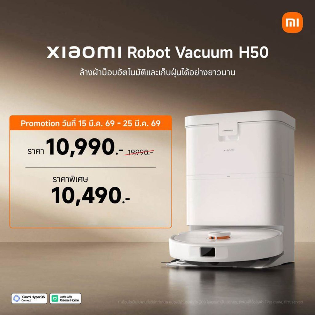 หุ่นยนต์ดูดฝุ่น Xiaomi Robot Vacuum H50 วางจำหน่ายในราคาพิเศษ 10,990 บาท2 (จากราคาปกติ 19,990 บาท) ตั้งแต่วันนี้ถึง 25 มีนาคม 2569 ที่ Xiaomi Store และร้านตัวแทนจำหน่ายที่ร่วมรายการทั่วประเทศรวมถึงช่องทางการจัดจำหน่ายทางออนไลน์แพลตฟอร์ม2 พิเศษ! เมื่อซื้อสินค้าตั้งแต่วันนี้ถึง 25 มีนาคม 2569 ผ่านช่องทาง mi.com และ Lazada3สามารถซื้อได้ในราคาพิเศษยิ่งกว่า 10,490 บาท2 (คูปองมีจำนวนจำกัด 200 ใบแรกเท่านั้นแจกตามลำดับผู้ที่ซื้อสินค้า First come, first served)3