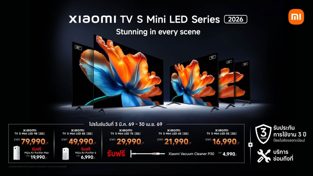 ทีวีอัจฉริยะ Xiaomi TV S Mini LED 2026 มีขนาดหน้าจอให้เลือก 5 ขนาดได้แก่ 55 นิ้ว, 65 นิ้ว, 75 นิ้ว, 85 นิ้วและ 98 นิ้วโดยขนาด 55 นิ้ววางจำหน่ายในราคาเริ่มต้นที่ 16,990 บาทพิเศษ! ลูกค้าที่ซื้อสินค้าตั้งแต่วันนี้ถึง 30 เมษายน 2569 รับฟรี Xiaomi Vacuum Cleaner P30 มูลค่า 4,990 บาท2ที่ Xiaomi Store และร้านตัวแทนจำหน่ายที่ร่วมรายการทั่วประเทศรวมถึงช่องทางการจัดจำหน่ายทางออนไลน์แพลตฟอร์ม mi.com และ Lazada2